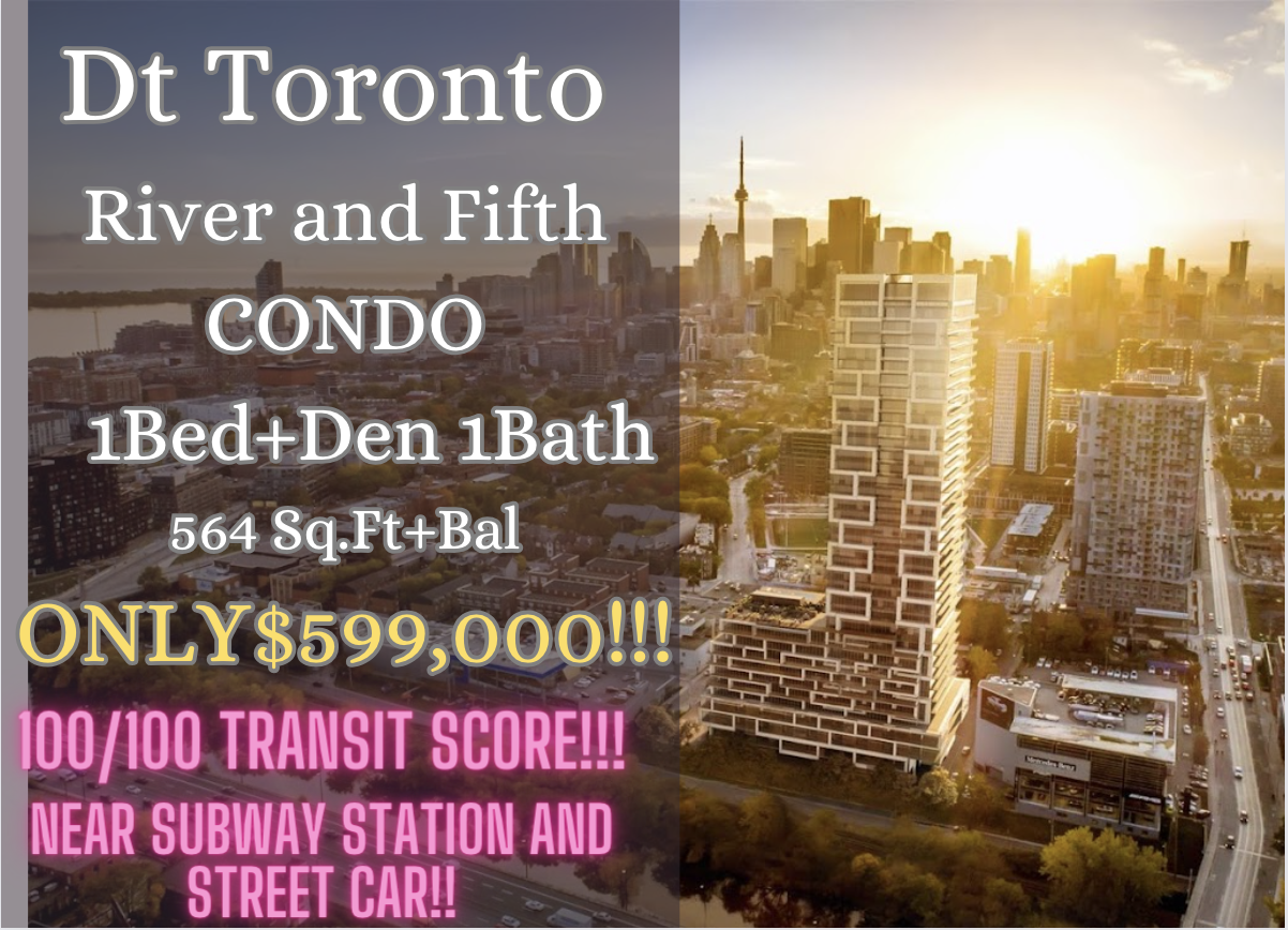 大捡漏!亏卖!酿酒厂来一套笋盘 – – River and Fifth Condo: 1房1卫+ den,564sqft 交通便利,分分钟步行到达ttc地铁站,有轨电车,公交站!免去养车成本! 现仅要价$599000, 绝佳捡漏机会!