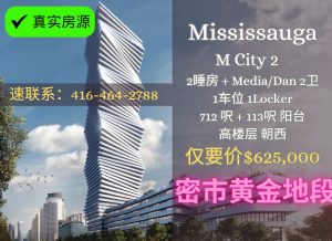 密西沙加市中心square one黄金地段MCITY CONDO 2房+Flex 2卫 712呎+113呎阳台 1车位1Locker 现在仅要62.5W