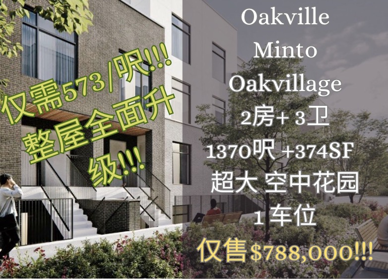 捡漏咯!!! 仅需$573/呎 Minto Oakvillage镇屋楼花转让: 2室3卫 带停车位 1370sqft + 374 sqtf 整屋全面升级 加装智能管家 仅要价$788,000!!!! 内含看房视频