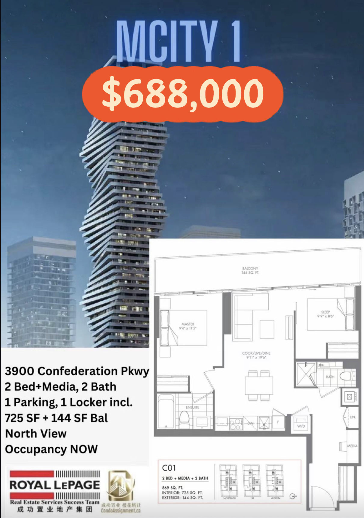 楼花转让:密西沙加-MCITY1-高层公寓-2房2卫/带车位-仅要价$688,000 — 马上入住!!!! 内含看房视频