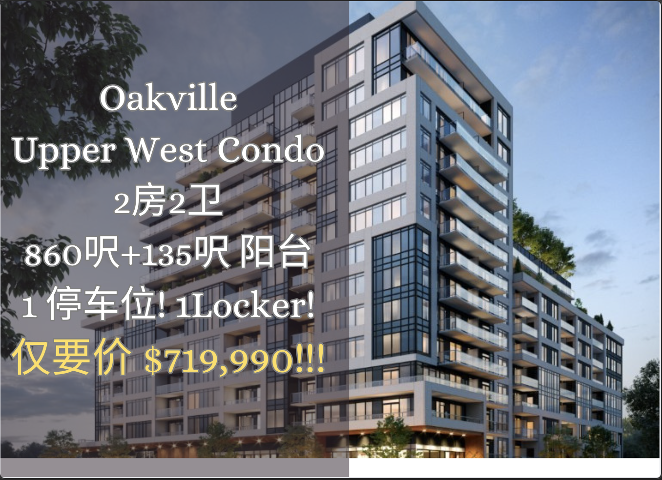 绝佳奥克维尔钻石地段Trafalgar 与Dundas 交界处 Upper West Condo 2房2卫 1车位 1locker 860sqft +135sqft阳台 朝北 仅要价$71.9w 6月入住
