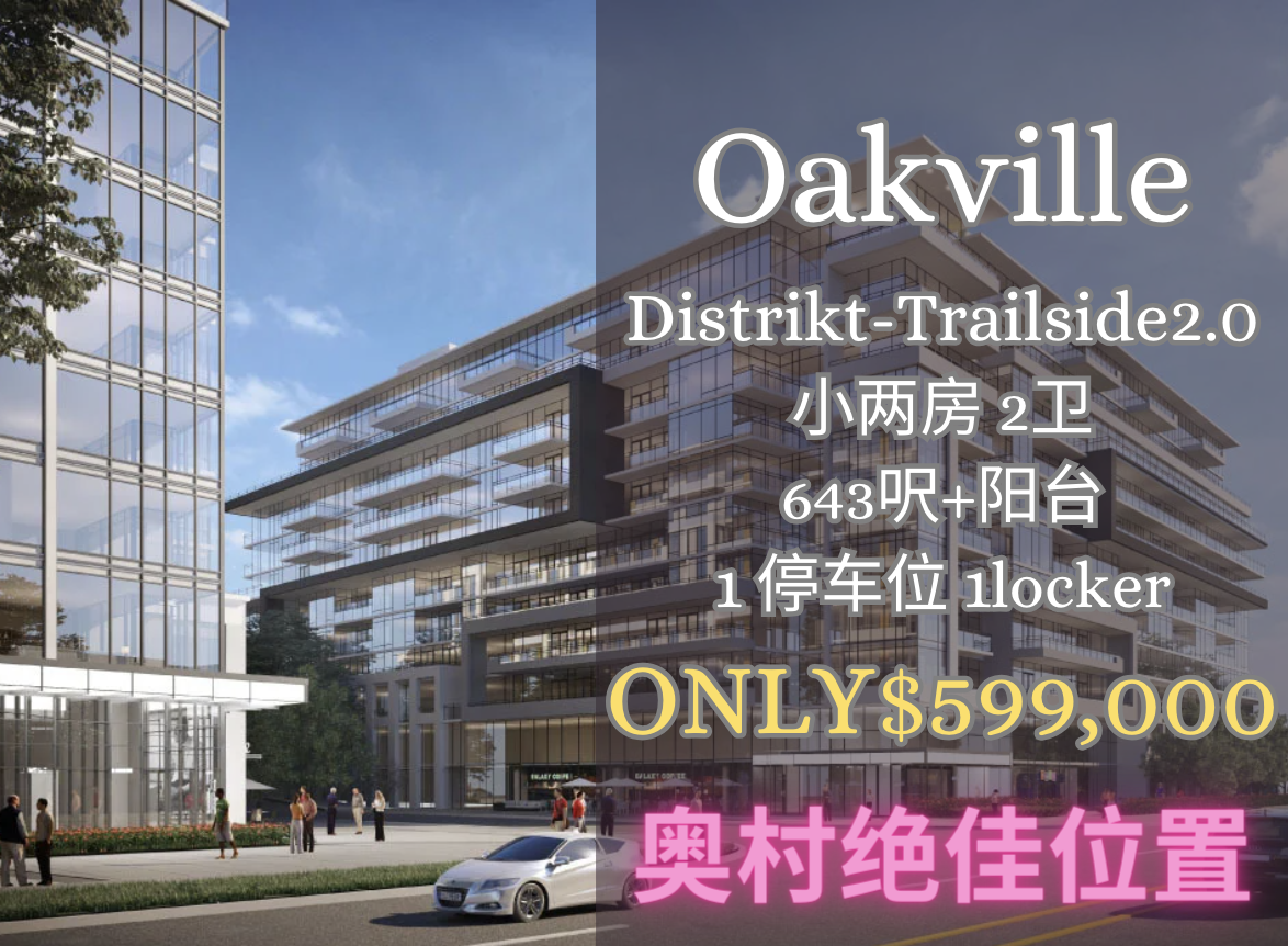 绝佳奥克维尔Distrikt Trailside一套朝东的小2房2卫 643SF!带车位locker,马上入住,仅叫 599,000万,投资自住均佳,赶快电话来☎☎
